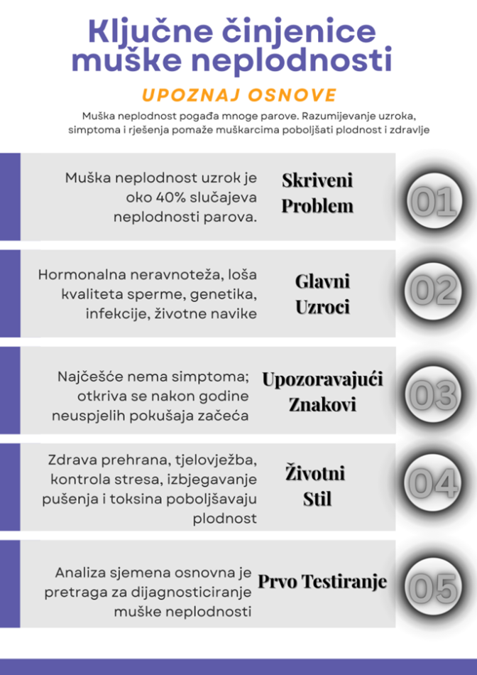 Iako se često misli da je neplodnost primarno ženski problem, statistike pokazuju da je muški faktor uzrok u otprilike 40 % svih slučajeva. Zbog toga je važno da se o muškoj plodnosti govori otvoreno i bez srama.